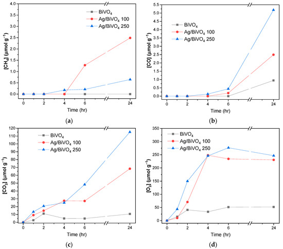 Gaseous reactant and product evolution vs. time over the BiVO4 and Ag/BiVO4 catalysts, (a) CH4, (b) CO, (c) CO2, and (d) O2.