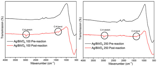 Pre- and post-reaction IR spectra of the two Ag-sputtered BiVO4 samples.
