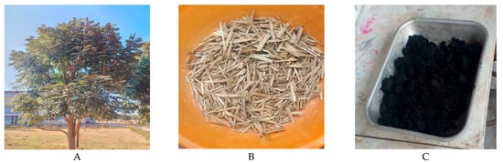 Activated carbon preparation stages from stem of Spathodea campanulata: A Spathodea campanulata plant (A), size-reduced Spathodea campanulata stem (B), and Spathodea campanulata activated carbon (C).