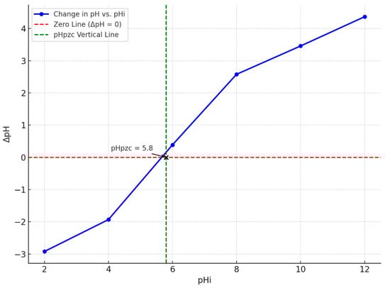 The pH point of zero charge indicates the condition at which the surface charge density of an adsorbent material is equal to zero. It provides information about the attraction and repulsion between the adsorbent and adsorbate. The pHpzc of activated carbon of spathodea campanulata is evaluated to be 5.8 as shown in Figure 2. This suggested that the surface of the adsorbent is dominated by positive charges below pHpzc and that negative charges dominate the surface of the adsorbent above a pH of 5.8. Normally, it is easier to adsorb cations on negatively charged surfaces and anions on positively charged surfaces []. Hence, the maximum removal efficiency of chromium recorded at a pH of 3 supports the pHpzc concept.