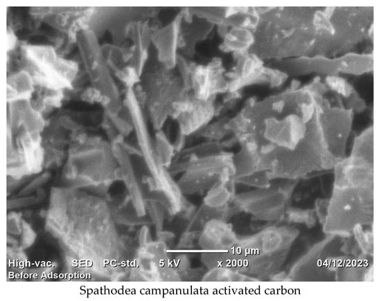 The BET specific surface area of Spathodea campanulata-derived activated carbon was determined to be 1054 m2/g. This surface area is higher compared to the surface areas of various biomass-based activated carbons, such as water hyacinth (203.83 m2/g) [], eucalyptus globulus (253.25 m2/g), and Onopordum heteracanthum (5.73 m2/g) []. The high surface area of this adsorbent material is attributed to the chemical activation, thermal treatment, and nature of the precursor material. Fundamentally, activated carbon having a higher surface area is effective in removing pollutants from water and wastewater due to enough active sites being present on the surface of the adsorbent [,]. The surface morphology of spathodea campanulata-derived activated carbon was analyzed using SEM, and the micrograph is presented in Figure 3. The adsorbent material is found to be porous with cracks and cavities resulting from chemical and thermal activations carried out to enhance the adsorption performance of the activated carbon. Normally, an activated carbon appearing porous enhances the removal of the intended material through the attachment of the adsorbate on the pores observed.