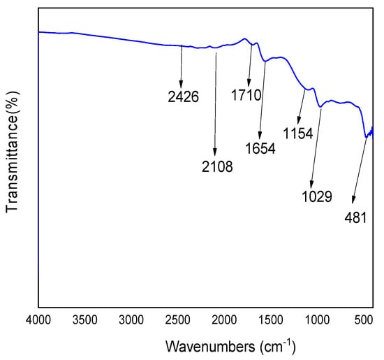 The FTIR analysis results of Spathodea campanulata-derived activated carbon are shown in Figure 4. The analysis showed that the adsorbent material is composed of various functional groups that could make it a potential candidate for the removal of chromium from water and wastewater. Specifically, the peak observed at 2426 cm−1 is attributed to the carbon–carbon double bond of the precursor material. Additionally, the peak found at 2108 cm−1 corresponds to the carbon hydrogen bond (C-H). On the other hand, the carbon oxygen (C=O) functional group is indicated by the peak observed at 1710 cm−1. The stretching vibration of carbon–oxygen functional groups is shown by the peak observed at 1658 cm−1. Moreover, the peaks observed at 1154 and 1029 cm−1 would indicate the C-O-C bond. Finally, the P=O is indicated by the peak observed at 481 cm−1 [].