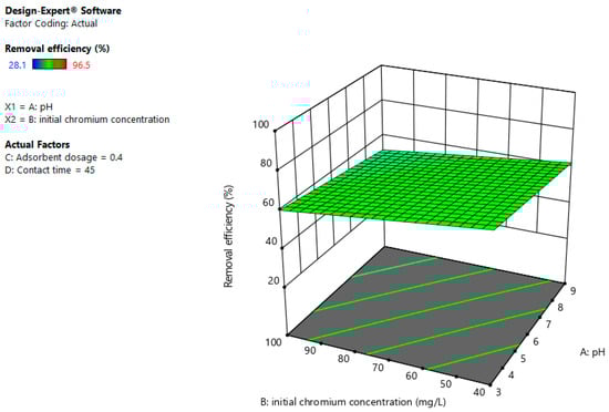 The 3D representation of the interaction effect of pH and adsorbent dosage is shown in Figure 5 using version 13. Fundamentally, the interaction between the adsorbent dosage and pH plays a significant role in the efficiency of chromium removal. In this study, the combined effect of pH and adsorbent dosage is found to negatively affect chromium removal. Moreover, the combined effect of pH and adsorbent dosage resulted in the maximum percentage removal of chromium ions at a lower pH and higher adsorbent dosage. A similar finding is reported in multiple papers. For instance, Beksissa et al. reported that the maximum removal efficiency of chromium is attained at a higher adsorbent dosage []. Similarly, Behera et.al. observed that the adsorbent dose had a synergistic effect on chromium removal efficiency, while pH had an antagonistic effect [].