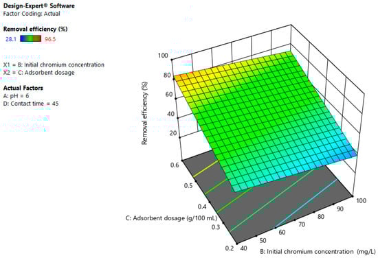 The interaction between adsorbent dosage and initial chromium concentration plays a significant role in determining the efficiency of chromium removal [,]. In this, the combined effects of the initial chromium concentration and adsorbent dosage are examined at a constant pH value of 6 and contact time of 45 min as shown in Figure 6. Normally, a lower initial chromium concentration and higher adsorbent dosage increase the removal efficiency of chromium. In this particular study, the combined effect of the initial chromium concentration and adsorbent dosage is determined to positively affect the adsorption process.