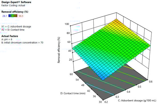 The interaction effect of adsorbent dosage and contact time on the removal efficiency of chromium using spathodea campanulata-derived activated carbon is presented in Figure 7. As indicated in Figure 7, the removal efficiency of chromium is positively impacted by the combined effects of adsorbent dosage and contact time. Normally, increasing the contact time increases the removal efficiency of pollutants from water or wastewater due to the increment of active sites available for adsorption. Likewise, increasing the contact time increases the possibility that the adsorbate will be attached to the specific surface of the adsorbent material [,,]. The maximum removal efficiency recorded as the contact time interacts with adsorbent dosage while holding the pH at 6 and initial chromium concentration of 70 mg/L was determined to be 89.6%.