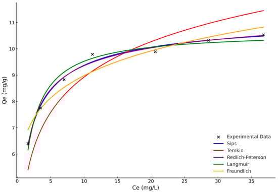 where Qmax is the maximum Langmuir adsorption capacity, KL is the Langmuir constant related to the adsorption capacity, and KF and 1/n are Freundlich constants related to the adsorption capacity and intensity []. Moreover, the Temkin [], Sips [], and Redlich–Peterson isotherm [] models are utilized to further elucidate the adsorption mechanism and are represented by Equations (6)–(8), respectively. These models provide insights into the adsorption process by describing various interactions and capacities of the adsorbent–adsorbate system.