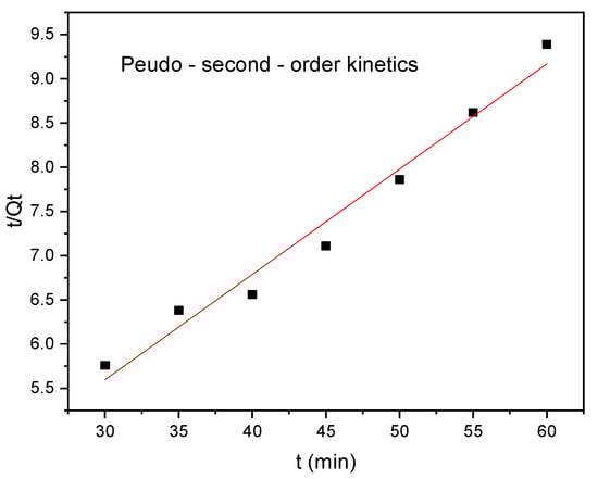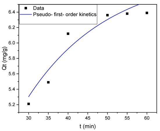 In Equation (6), K1 (g/(mg min)) refers to the pseudo-first-order constant, Qe is the equilibrium adsorption capacity in mg/g, and t (min) represents the contact time. Additionally, K2 and Kd are the pseudo-second-order and intraparticle diffusion constants, respectively, whereas C is the concentration [].