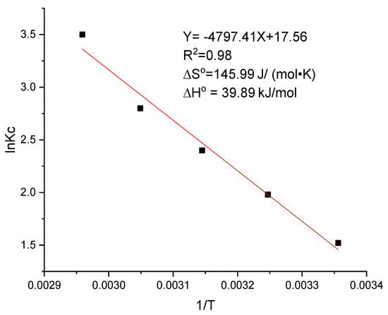 Thermodynamics parameters for the adsorption of hexavalent chromium onto Spathodea campanulata-based activated carbon unveil useful information on the nature of the adsorption process, as shown in Figure 12. The positive of 39.89 kJ/mol indicates that the adsorption process is endothermic; thus, with increasing temperature, the adsorption capacity increases since the system absorbs heat. The positive 145.99 J/(mol·K) is indicative of increased randomness at the solid–liquid interface during the adsorption process, improving system disorder. The consistently negative GO values (O = −3.62 kJ/mol, −5.08 kJ/mol, −6.54 kJ/mol, −8.00 kJ/mol, and −9.46 kJ/mol at 298 K, 308 K, 318 K, 328 K, and 338 K, respectively) confirm the spontaneous nature of the adsorption, emphasizing its thermodynamic feasibility under the studied conditions. Collectively, these parameters indicate that the adsorption of hexavalent chromium onto Spathodea campanulata-derived activated carbon is a spontaneous, endothermic process driven by increased disorder and is enhanced at elevated temperatures, making it a promising approach for chromium remediation [].
