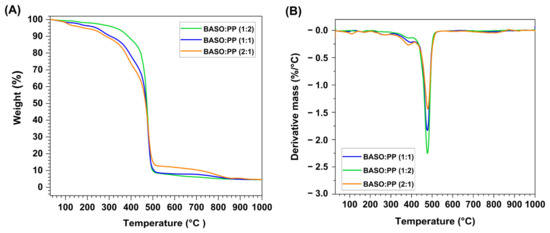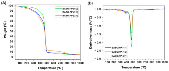 The thermal degradation profile of individual polypropylene samples (PP) and the cottonseed oil dregs (BASOs) and their mixes (1:1), (1:2), and (2:1) were evaluated by thermogravimetric analysis (TGA). From Figure 1A, it is possible to observe the loss of mass of the individual BASOs and PP samples in relation to the increase in temperature.