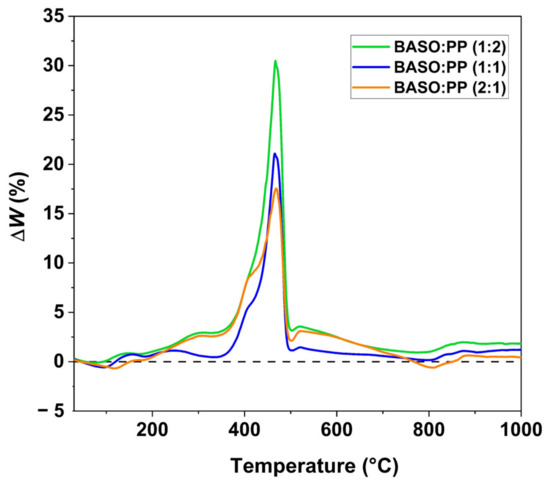 The thermal behavior of the mixtures of BASO and PP, (1:1), (1:2), and (2:1), was also evaluated, as shown in Figure 2.