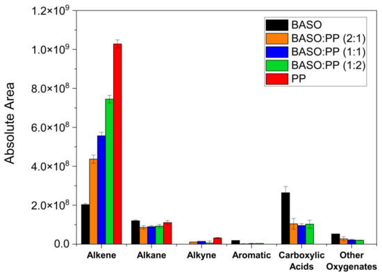 When evaluating Figure 4, it was observed that the pyrolysis of PP has, as its only product, the hydrocarbon class; this is due to the composition of the plastic waste, where there are only polymerized chains of isoparaffins. The products obtained in this pyrolysis are precisely the result of the depolymerization of these chains [43]. As for the cottonseed oil dregs, we have the majority production of carboxylic acids that come from the primary degradation of TAGs. Along with this, the amount of alkenes and alkanes can be explained through the cracking of fatty acids through decarboxylation and decarbonylation reactions, which consist of the release of CO2 and CO + H2O, respectively, where these two routes can lead to hydrocarbon production.