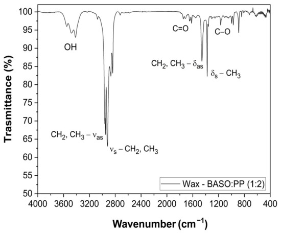 For the FTIR spectrum of solid wax produced during the pyrolysis process, Figure 5, it was observed that the material is mainly composed by paraffinic material, confirmed by the symmetric and asymmetric stretching of 1300–1400 cm−1 and 2800–3000 cm−1, characteristic of CH2 and CH3 in aliphatic chains. Between 3400 and 3600 cm−1, we can see the wax from BASO:PP (1:2), a band characteristic of the OH stretch, in a possible intramolecular interaction, from residual carboxylic acids from the pyrolysis process. The peaks at 1745 cm⁻1 and 1164 cm⁻1 are attributed to C=O and C–O stretching, respectively, reinforcing the hypothesis of the presence of residual carboxylic acids.