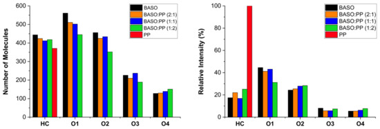 Ultra-high resolution mass spectrometry can help to evaluate the chemical composition of complex mixtures as well as to understand the mechanisms of thermal cracking of macromolecules during the pyrolysis process. Figure 6 shows that the main pyrolytic liquid constituents are distributed in the HC class for PP, while BASO also includes oxygenated classes as O1, O2, O3, and O4. The number of molecules in the HC class follows the increasing trend from PP to BASO. The main observation was the synergistic effect of PP to help in decreasing the O1 and O2 classes, corroborating the data from GC/MS, producing more alkenes with the greatest impact on the process BASO:PP (1:2).