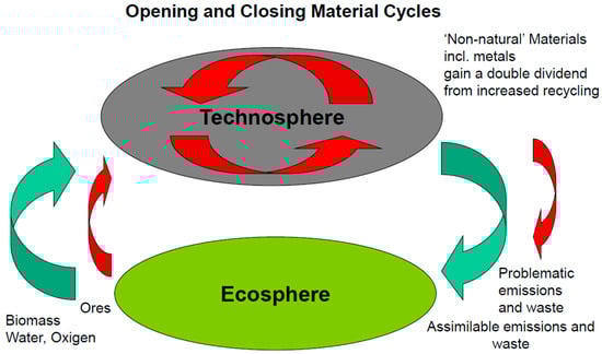 The concept of the circular economy focuses primarily on cycles within the technosphere. In addition, the question arises as to whether the cycles of the technosphere and the ecosphere are open or closed to each other. Raw materials are extracted from the ecosphere, preferably in a sustainable way. On the other hand, only substances that are as easily degradable and compostable as possible should be introduced into the ecosphere. Persistent substances, toxins, or nutrients that are capable of disrupting the natural material cycles and cannot be assimilated must be kept away from the ecosphere (Figure 1) [].