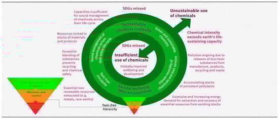 On the one hand, chemistry provides many tools that help to achieve the United Nations’ Sustainable Development Goals (SDGs) []. We need the products of the chemical industry for the generation and storage of renewable energy, clean water, hygiene and health, thermal insulation, mobility, and corrosion protection. A world free from synthetic chemicals is inconceivable and would not be desirable. On the other hand, chemicals can pose a risk to people and the environment and jeopardize the achievement of the SDGs.