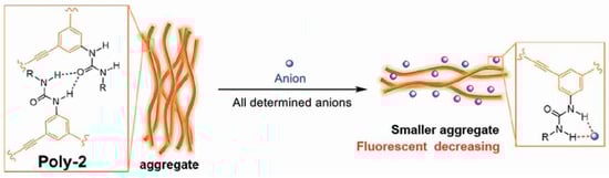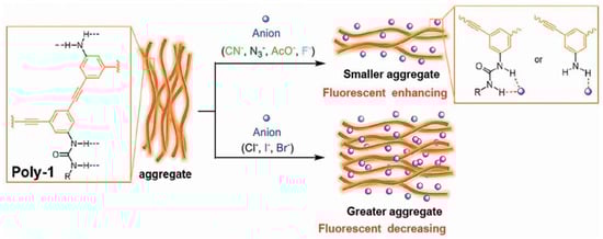 Notably, the loss in intensity upon the addition of anions revealed a decrease in basicity. While the binding capability of ureas has been reported to rely on the basicity of anions [117,193], Li et al. determined that a stronger binding of basic anions to the acidic urea groups would therefore explain the disassembly of 1 (Poly-1) aggregates in a solution thus causing an increase in fluorescence intensity. This illustrated an aggregation-caused quenching (ACQ) effect; see Figure 2 [192]. Here, highly basic CN- caused a strong disaggregation of 1 (Poly-1), whereas weakly basic Br- caused further assembly.