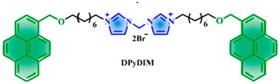 The anion-sensing properties were analyzed using a variety of anions, and the aggregates of 3 (DpyDIM) were found to show an increased emission of the monomer and a decreased intensity of the excimer peak. Here, Qiao et al. reported ratiometric responses into two types: The first type was characterized by excimer reduction and monomer enhancement, which was illustrated by the addition of inorganic pyrophosphate (PPi). This was also reported for the titration of ATP, AMP, S2O82−, S2O32−, SO42−, SO32−, HSO4−, and HSO3–. The second type was determined to be where excimer intensity is reduced along with monomer intensity increasing; this was exhibited upon the addition of sodium dodecyl sulfate (SDS). Both are depicted in Figure 5. Their results were determined to be dependent on the negative charge of the phosphate ions and suggest that the electrostatic interaction between the cationic imidazolium unit and anions is a key factor in the ratiometric response. Since electrostatic interactions can also be attributed to aggregation, these interactions can cause the aggregated state to vary where the pyrene moieties could separate from each other [194].