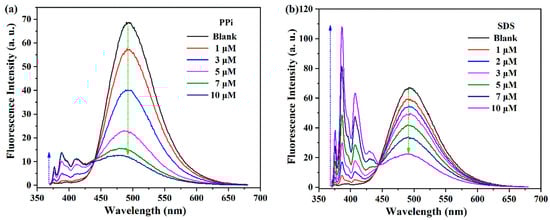 Emission spectra of 10 uM aqueous 3 (DpyDIM) (a) upon addition of PPi, and (b) upon addition of SDS. Reprinted with permission from ref. [194].