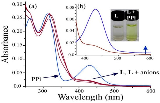 (a) Absorbance spectra of 4 with various anions; (b) color change upon addition of PPi to L (4). Reprinted with permission from ref. [195].