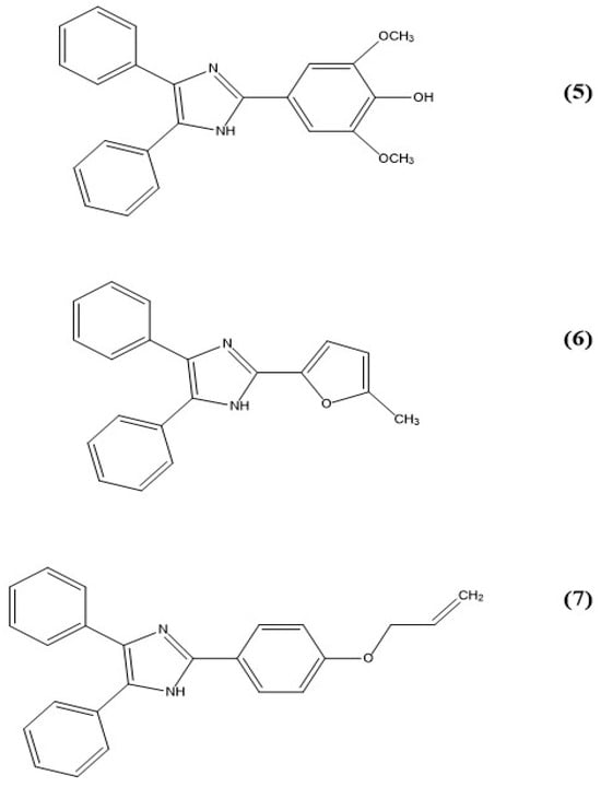 Another set of imidazole-based sensors was developed by Jigyasa and Rajput in 2018. These triaryl systems were employed for the detection of explosives in an aqueous solution. Jigyasa and Rajput synthesized three sensors, 5 (S1), 6 (S2), and 7 (S3); see Figure 8 [197].
