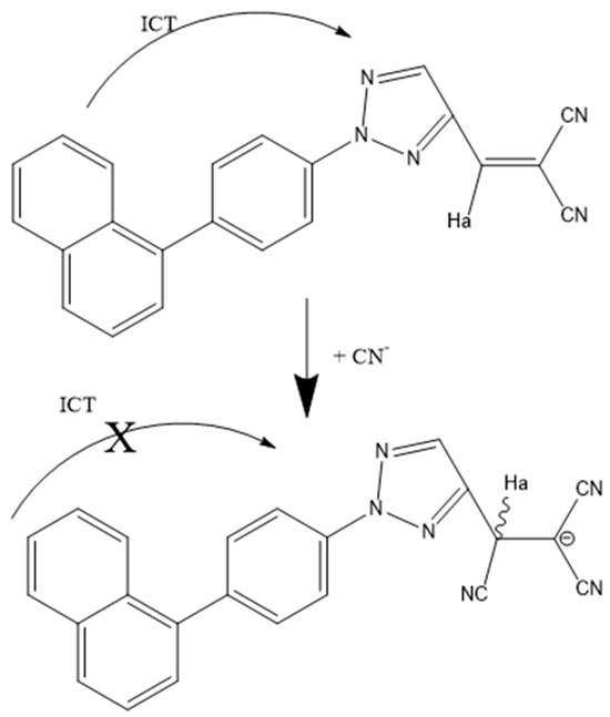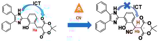 The authors postulated that this color change was attributed to the nucleophilic attack of cyanide ions at the dione–vinyl site, causing an effect in the intramolecular charge transfer (ICT) process of 8 (BMA). On the other hand, fluorescence experiments revealed an excitation of 8 at 350 nm created an emission at 438 nm. After cyanide anions were added, a blue-shifted emission band at 420 nm formed, and a peak at 438 nm disappeared. Fluorescent titrations revealed that cyanide ions restricted the ICT transition of the molecule, thus causing a decrease in emission at 438 nm upon an increasing addition of cyanide. In tandem with the depletion at 438 nm, a color change from blue-green to blue fluorescence was observed. The proposed mechanism of action is shown in Figure 10 [198]. An LOD of 7.87 nM was determined, which is under the permissible level for cyanide in drinking water, and real water samples were also tested with 8 (BMA). Here, a 92.9–99.4% recovery and 1.40% relative standard deviation were obtained for the additions of 2.0, 4.0, and 6.0 μM in tap, distilled, and lake water with 8 (BMA). These results are promising for the real-time application of cyanide sensing.