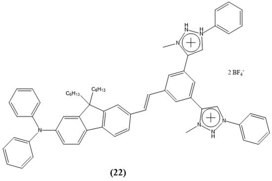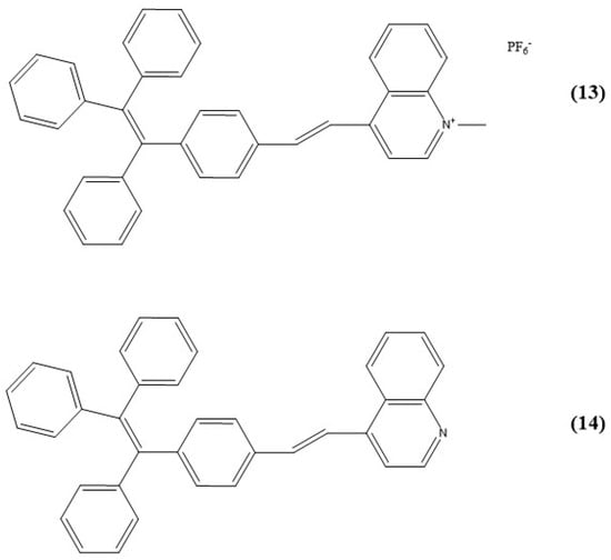 With the ease of anion sensing via a N-H bond, quinoline is commonly employed as quinolinium for anion-sensing means where the nitrogen on the heterocyclic ring obtains additional hydrogen and exhibits a positive charge. Zhang et al. in 2016 used this moiety to create fluorescent sensors for iodide anions via an AIE. Here, two tetraphenylethene (TPE)-functionalized quinolinium salts with hexafluorophosphate (PF6−) were synthesized as potential sensors (13 (TPE-QN) and 14 (TPE-QI)); see Figure 14 [200].