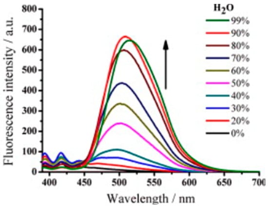 With its nonpolar nature, 9-anthraldehyde is a suitable solute in DMF, THF, MeOH, etc. When excited at 395 nm, it is nonemissive; this is true even in more polar solvents like DMSO due to ICT. However, upon the addition of water to the DMSO mixture (0–99%), a strong emission peak appears at 516 nm. In fact, when the volume fraction of water reached a maximum of 99%, the intensity increased by 90 times compared to that of pure DMSO; see Figure 16 [201]. This newly formed emission peak corresponds to the excimer emission of anthracene [202,203].