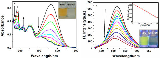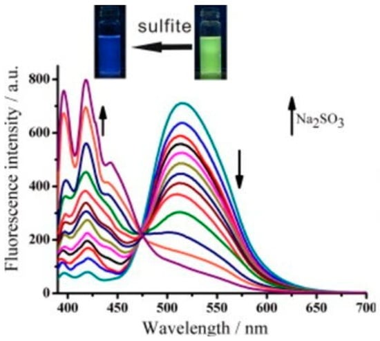 Since aldehyde groups are known to interact with sulfites to produce sulfonate, Xie et al. determined that this could lead to possible excimer dissociation and thus monomer emission. When the sensor was added to sodium sulfite, the fluorescence decreased at 516 nm and depicted a simultaneous increase in emission intensity at 416 nm with an isoemissive point. This indicated a clear conversion of the aggregated probe to the negatively charged monomer formed upon the reaction with sulfite ions; see Figure 17 [201].