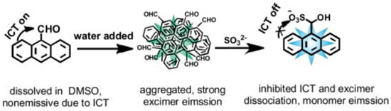 This sensing mechanism was detailed by Xie et al. from the interaction of the 9-anthraldehyde aggregates, which display a yellow-green emission, and once in contact with sulfites, the aggregate dissociates and produces a blue monomer emission. This is illustrated in Figure 18 [201]. This system highlights a large separation in emission wavelength, as well as a highly sensitive detection to sulfite ions, and provides a limit of detection of 3.19 μM, making it highly applicable for real water samples.