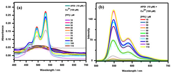 (a) Absorbance spectra; and (b) fluorescence spectra of 16-Cu2+ (ADPI-Cu2+) aggregates upon the addition of PPi in an aqueous solution. Reprinted with permission from ref. [204], where ADPI is the sensor (16).