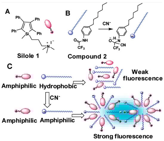 On the other hand, when anions were added to a solution of 2 (Poly−2), the intensity for all anions decreased regardless of basicity, but the addition of CN- also illustrated a strong red shift from 442 nm to 464 nm. This illustrates strong selectivity to be employed in CN- sensing. Contrary to 1 (Poly−1), the addition of the anions causing a decrease in fluorescence intensity resulted in smaller aggregates but illustrated an aggregate-induced emission (AIE) effect; see Figure 3 by Li et al. Both systems elegantly highlight the varying degrees of aggregation that can be employed for anion sensing.