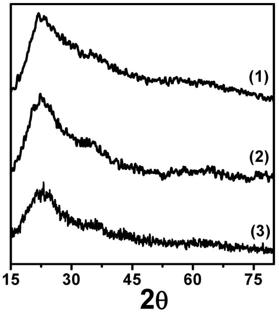 The X-ray powder diffractograms for Cu/SiO2-PD are shown in Figure 1. For the hydrated, calcined, and reduced–passivated samples of Cu/SiO2-PD (Figure 1, diffractograms (1), (2), and (3)), only the amorphous halo in the 2θ range 20–30°, attributed to the SiO2 support, was observed. This indicates that the Cu phase is supported on the internal surface of silica pores forming crystalline domains smaller than 4 nm, as previously reported [31].