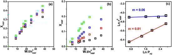 The influence of hydrogen pressure () was investigated at 393 K and varying between 200 and 1500 kPa at two different initial HMF concentrations ( = 0.13 M and = 0.04 M). Figure 3a,b show the HMF conversion as a function of for different and two different . For = 0.13 M (Figure 3a), the conversion profiles did not show significant differences between them, especially at HMF conversion levels below 30%. The calculated for these runs showed approximately the same values (run 4,9–11; Table 3). In contrast, when the initial HMF concentration was 0.04 M (Figure 3b), the increased as increased (run 2,6–8; Table 3). The apparent reaction order of H2 (m) at the two concentrations was estimated by applying a linear regression over the plot of , as shown in Figure 3c. The estimated m was (0.06 ± 0.08) at a 0.13 M initial HMF concentration, explaining the lack of influence of H2 pressure on the initial rate of the HMF hydrogenation. However, the estimated m for an initial HMF concentration of 0.04 M was (0.81 ± 0.07), in agreement with the positive effect of H2 pressure on the HMF hydrogenation rate (Figure 3c) at this level of HMF concentration.