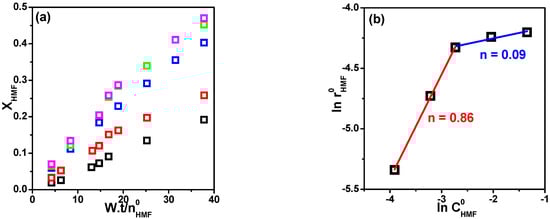 Table 4 also presents the apparent orders of reaction with respect to HMF obtained from the non-linear regression of data for conversions below 30% (Figure 5b) and using Equation (1) (model 1). The estimate for n obtained from this fitting was (0.78 ± 0.11), which is in good agreement with that obtained from the linear regression of (0.86 ± 0.07).