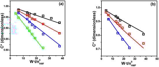 In both equations, the HMF concentration is expressed in a dimensionless way (C* = ) to make explicit the presence of the initial HMF concentration () as a parameter for consideration.