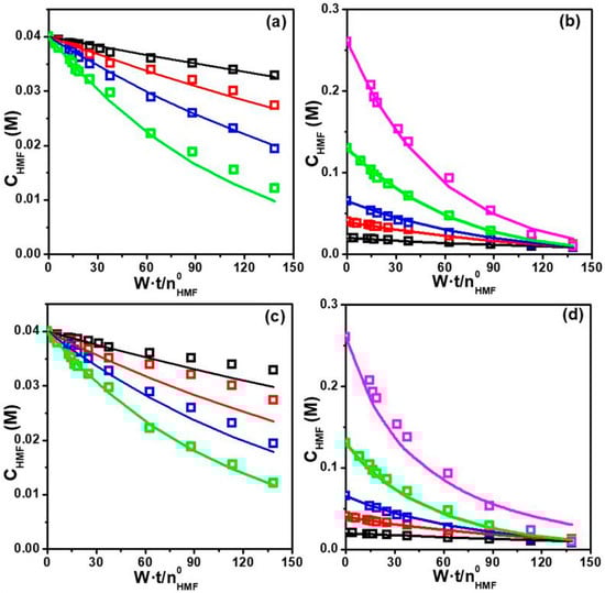 The stirring speed and particle size used, 760 rpm and less than 75 μm, respectively, over all runs were suitable to ensure that external and intraparticle mass transfer were not controlling the reaction rate. Under these conditions and for modeling purposes, any possible mass transfer limitations could be ruled out [44,45]. It is also important to remark that all experiences for kinetic modeling were performed with a constant W/n0HMF ratio (catalyst mass/HMF initial moles) equal to 25 g/mol and the same fluid dynamics conditions. The mass balance of HMF corresponding to the type of reactor used in this work can be expressed by Equation (A1).