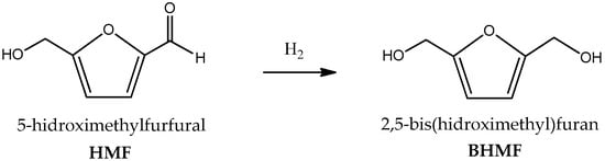 Currently, there is a consensus that platform molecules derived from lignocellulosic biomass should be explored as alternatives to fossil-derived molecules, as they are widely available, are low-cost, and do not compete with food [6]. Among them, 5-hydroxymethylfurfural (HMF) stands out for its great potential to replace petroleum-based molecules due to its high chemical reactivity, which allows it to be converted into a variety of valuable compounds [7,8,9,10]. One of the compounds to which HMF can be converted is 2,5-bis(hydroxymethyl)furan (BHMF). This compound could be used in the production of biopolymers, such as polyurethanes and polyesters, which are among the most widely used plastics in the world [9,10]. A reaction scheme showing the selective HMF hydrogenation to BHMF is shown in Scheme 1.
