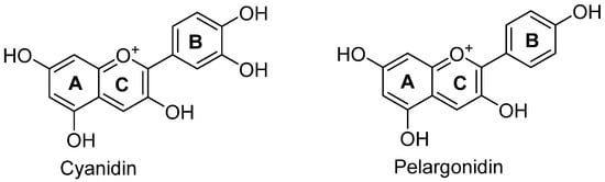 (g) Molecular diversity and variability: Anthocyanins come in various forms, with slight structural differences across different plant species. These structural differences, including variations in the type of sugar or the hydroxylation pattern on the aromatic ring, can affect the color and stability of anthocyanins. Some anthocyanins are more stable than others due to their molecular structure, and this variability can create challenges for standardizing the use of anthocyanins in industrial applications [84]. For example, pelargonidin and cyanidin structures (as shown in Figure 2) are two common anthocyanins that produce red and purple colors, respectively. However, pelargonidin is generally less stable than cyanidin and more prone to degradation when exposed to light, oxygen, slightly alkaline pH, and heat [59]. The degradation of anthocyanins like cyanidin and pelargonidin is influenced by the number and position of hydroxyl groups on their B-ring, not the C-ring. Cyanidin has two hydroxyl groups on the B-ring (at positions 3′ and 4′), while pelargonidin has only one (at position 4′). Although ortho-dihydroxyl groups (adjacent hydroxyls) can stabilize the flavylium ion through intramolecular hydrogen bonding, neither cyanidin nor pelargonidin possesses an ortho-dihydroxy arrangement on the B-ring, so intramolecular hydrogen bonding is unlikely in these anthocyanins. However, reports indicate the presence of additional hydroxyl groups can facilitate intermolecular hydrogen bonding with solvent molecules or other compounds, indirectly helping to stabilize the flavylium ion’s positive charge. Moreover, compounds with multiple hydroxyl groups can exhibit better electron delocalization, contributing to greater resistance to degradation, especially under acidic conditions [84,85,86,87,88].