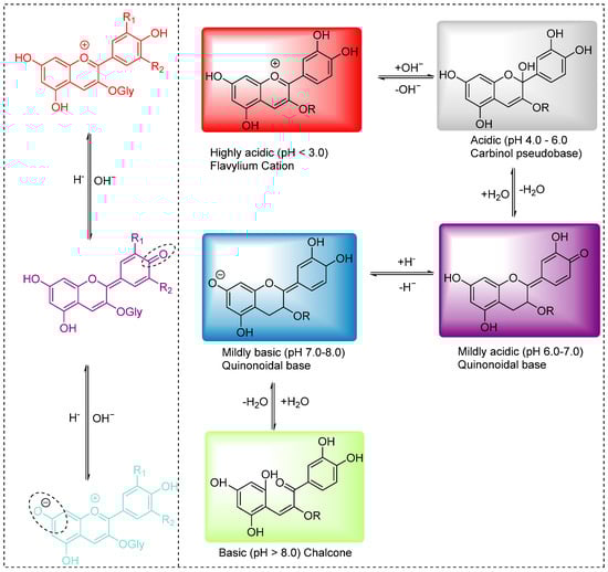 (a) pH-sensitive: The color properties of anthocyanins are highly sensitive to any change in the pH levels, and their structure is vulnerable to any change in pH (acidic or alkaline environment) [65,66,67,68]. At lower pH (acidic conditions), anthocyanins exhibit red, purple, or blue shades. However, in alkaline conditions, anthocyanins can undergo chemical changes, resulting in their color loss. Specifically, under alkaline conditions, anthocyanins undergo a transformation where the flavylium ion (the chromophore responsible for their color) is deprotonated (as shown in Figure 2), resulting in a shift to a colorless or brownish form. For example, the purple pigment from red cabbage, which is rich in anthocyanins, can change to green or blue when exposed to alkaline substances such as baking soda or certain salts. This structural sensitivity to pH limits the use of anthocyanins in products where pH stability is crucial. For example, delphinidin (found in blueberries and grapes), are highly sensitive to pH. For example, cyanidin-3-glucoside (found in strawberries and raspberries) changes color depending on the pH, becoming more purple in neutral conditions and red in acidic conditions. This pH sensitivity makes it difficult to maintain consistent color in food products that undergo pH changes during processing or storage.