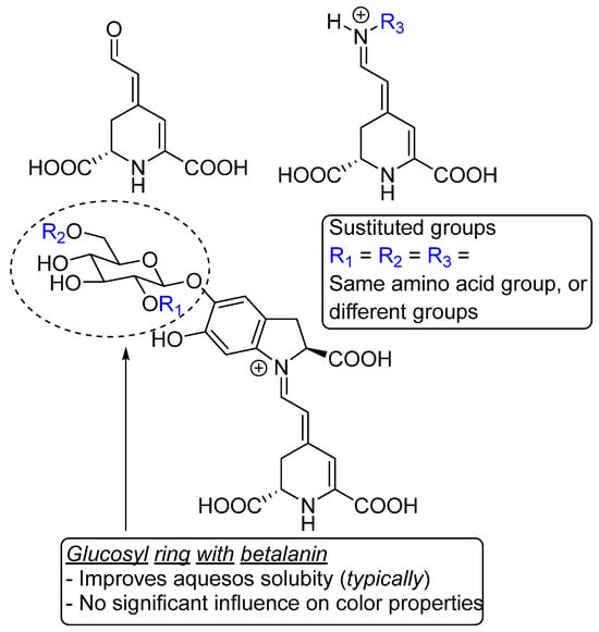 (a) Susceptibility to pH changes: One of the major structural issues with betalains is their pH sensitivity. Similarly to anthocyanins, the color properties of betalain structure can be influenced by the acidity or alkalinity of the environment, although their response is different due to their unique chemical structure. For example, betacyanins are more stable in acidic conditions and can lose their bright color in alkaline (basic) environments. At higher pH, the betalain molecule undergoes structural changes, leading to a loss of the red to violet color and often resulting in a shift toward a brownish or colorless form. This occurs because the betalain molecule is chemically unstable in alkaline conditions, causing a degradation of the chromophore (the part of the molecule responsible for its color). Betaxanthins can also experience color shifts under extreme pH levels, although they are generally more stable in neutral to slightly acidic conditions. In general, this pH sensitivity limits the use of betalains in formulations that require stable color properties across a wide range of pH values (e.g., in beverages or processed foods with varying acidity).