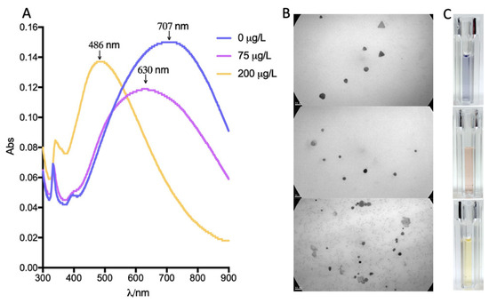 UV–visible spectroscopy is a selective and efficient technique that can be used to reveal the formation of AgTNPs and their modification when they are in contact with iodide. The spectroscopic absorption at a specific wavelength allows the identification of each compound. As can be observed in Figure 1, the AgTNPs show maximum absorption at a wavelength of 707 nm. When iodide was added to the AgTNP solution, the absorption wavelength maximum shifted to a band centered at 630 nm and at 486 nm when 75 µg I−/L or 200 µg I−/L was added, respectively (Figure 1A).