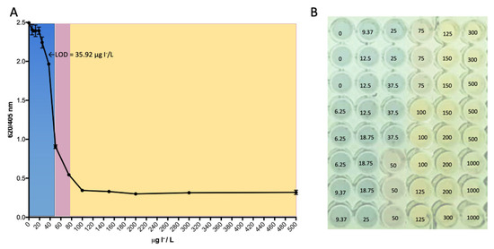 Effect of iodide on the crucial color conversion of AgTNPs. (A) Absorbance ratio 620/405 nm of AgNTPs vs. iodide concentration μg I−/L. The experiment was performed in triplicate. The vis spectrophotometry was obtained using a microplate reader with a polypropylene 96-well plate with 350 µL in each well. The values are shown as mean ± SEM. (B) Photography of 96-well plates with AgTNPs exposed to 0, 6.25, 9.37, 12.5, 18.75, 25, 37.5, 50, 75, 100, 125, 150, 200, 300, 500, 1000 μg I−/L.