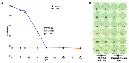 Effect of charcoal-stripped urine spikes with iodide on AgTNPs. (A) Comparison of absorbance ratio 620/405 nm when different iodide concentrations µg I−/L in aqueous solution and in charcoal-stripped urine are added to AgTNPs solution. The experiment was performed in triplicate. The vis spectrophotometry was obtained using a microplate reader with a polypropylene 96-well plate with 350 µL in each well. The values are shown as mean ± SD. The curves were analyzed using Pearson’s correlation. (B) Photography of microplate wells with AgTNPs exposed during 1 h to 0, 25, 37.5, 75, 100, 150 μg I−/L.