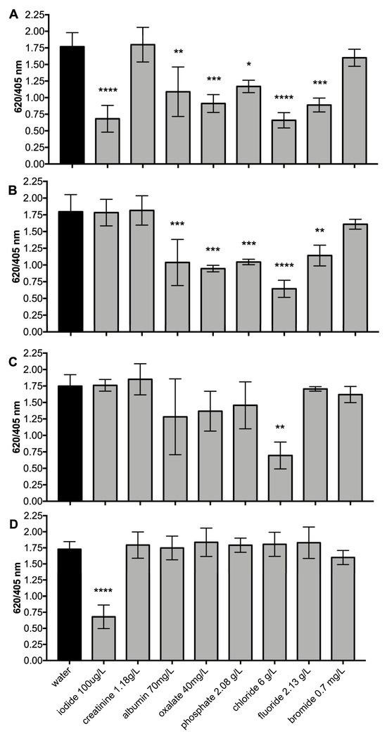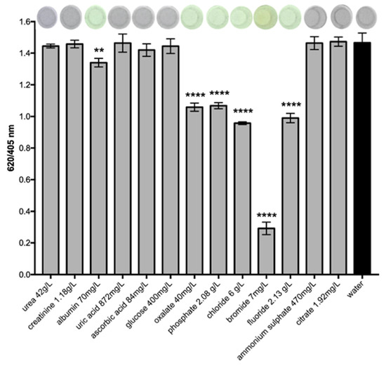 Human urine is a complex matrix mainly composed of water (95%). The predominant compounds and ions found in urine are urea (2%), creatinine (0.1%), uric acid (0.03%), chloride, sodium, potassium, sulfate, ammonium, phosphate, and a minor quantity of further molecules and ions [29]. To evaluate the effect of the main molecules and ions found in urine on AgTNPs, the nanoparticles were incubated with the maximal concentrations reported in urine for urea, creatinine, uric acid, chloride, phosphate, and sulfate. Other molecules of interest found in urine were also assayed, such as albumin, ascorbic acid, glucose, oxalates, citrate, as well as other halogens like bromide and fluoride. When the absorbance ratio of AgTNPs is analyzed, it shows that albumin, oxalates, phosphate, chloride, bromide, and fluoride significantly interfere with the AgTNP SPR band absorption ratio compared with water [28,29,30,31,32,33] (Figure 4). These results agree with previous reports using different Ag nanoparticles that indicate that the compounds and ions commonly found in urine (Cl−, Br−, F−, H2P04−, SO42−, CH3COO−, SCN−, NO3−, ClO4−, albumin, and oxalates) interact with silver atoms, inducing a shift on the SPR band spectra, which corresponds with the shape transformation in a time- and concentration-dependent manner [37,38,39]. Altogether, with the view to using AgTNPs on urine samples, it is necessary to eliminate the interference to detect iodide sensitively.