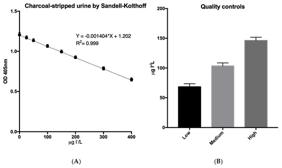 To compare the efficacy of the SPE protocol on urine, a calibration curve of charcoal-treated urine spiked with iodide and quality control samples was assessed using the Sandell–Kolthoff reaction. The calibration curve showed linearity in the concentration range from 25 to 400 µg I−/L, with an R2 coefficient of 0.999 (Figure 6).