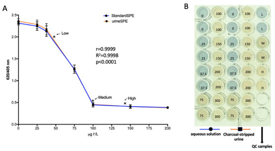 Efficacy of the SPE protocol combined with the use of AgTNPs to determine urine iodide. (A) Comparison of the absorbance ratio 620/405 nm of AgTNPs vs. iodide concentration µg I−/L in aqueous solution and in charcoal-stripped urine. The experiment was performed in triplicate. The vis spectrophotometry was obtained using a microplate reader with a polypropylene 96-well plate with 350 µL in each well. The values are shown as mean ± SD. The curves were analyzed using Pearson’s correlation. The concentrations of the QC low, medium, and high were interpolated from the standard curve based on charcoal-stripped urine. (B) Photography of microplate wells with AgTNPs exposed during 1 h to 0, 25, 50,100, 150, 200, and 300 µg I−/L, and QC low (L), medium (M), and high (H).