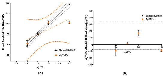 Comparison of Sandell-Kolthoff reaction vs. AgTNPs after SPE. (A) Regression comparison of Sandell-Kolthoff reaction vs. AgTNPs after SPE using charcoal-stripped urine spiked with 50, 75, 100, and 150 μg I−/L. The experiment was performed in triplicate. The values are shown as mean ± SD. (B) Bias plot of the difference between AgTNPs and Sandell-Kolthoff reaction after SPE in charcoal-stripped urine spiked with 50, 75, 100, and 150 μg I−/L. The experiment was performed in triplicate. The values are shown as mean ± SD.