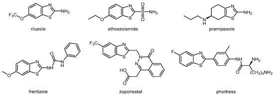 Derivatives of benzothiazole represent a prominent class of heterocyclic compounds which attract considerable interest due to their diverse biological activities such as antitumor [11,12,13], antibacterial [14,15], antitrypanosomal [16,17], anti-inflammatory [18], and antiviral [19,20] properties. Their potent bioactivity makes the benzothiazole scaffold a valuable pharmacophore in medicinal chemistry, and it is featured in numerous clinically approved drugs used to treat a variety of diseases. Notable examples include Riluzole, Ethoxzolamide, Pramipexole, Frentizole, Zopolrestat and Phortress (Figure 1) [21,22]. Benzothiazole is recognized as a privileged scaffold in drug design due to its structural versatility and broad therapeutic relevance, underscoring its strong potential in anticancer drug development [23,24].