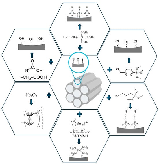 These characteristics, along with the structural tunability through synthesis parameters (surfactant type, pH, temperature, and template removal method), enable the tailoring of their physicochemical properties [,]. For specific application requirements, functional groups can be selectively anchored onto the surface to generate functionalized mesoporous materials.