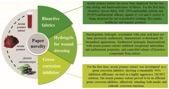 Most prior work focuses either on improving extraction yields or on developing a single value-added product (e.g., food ingredients, purified anthocyanins, etc.). The present study moves beyond single-product outcomes by extracting bioactive compounds from aronia pomace and using them for developing three novel products: colored healthcare textiles, biomedical hydrogels, and green corrosion inhibitor. This approach demonstrates how a single low-cost by-product stream can feed multiple higher-value supply chains, improving resource efficiency and commercial feasibility.